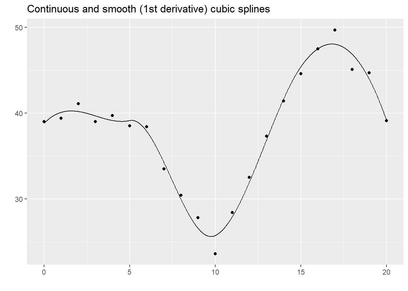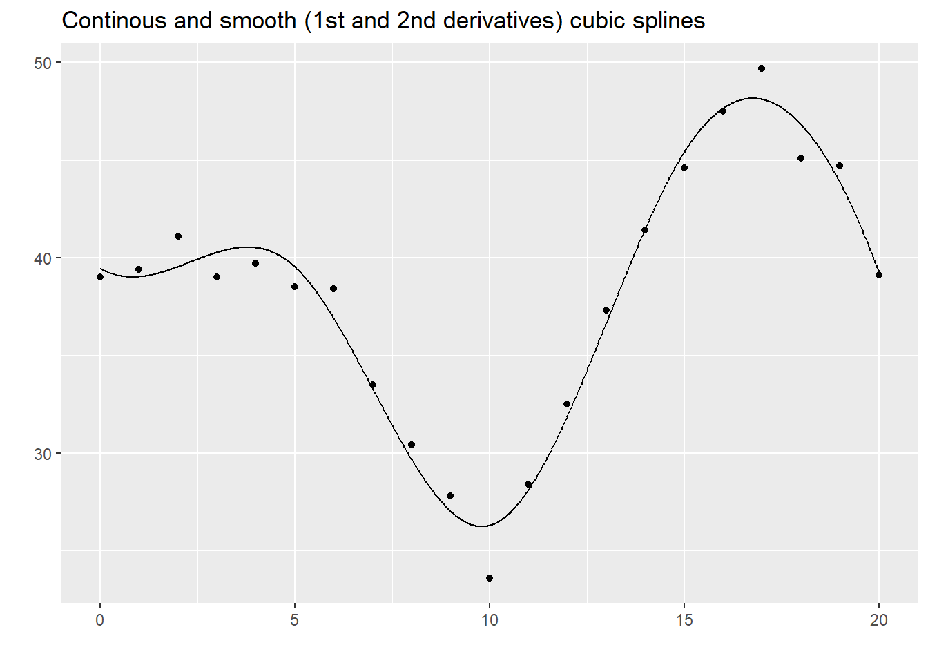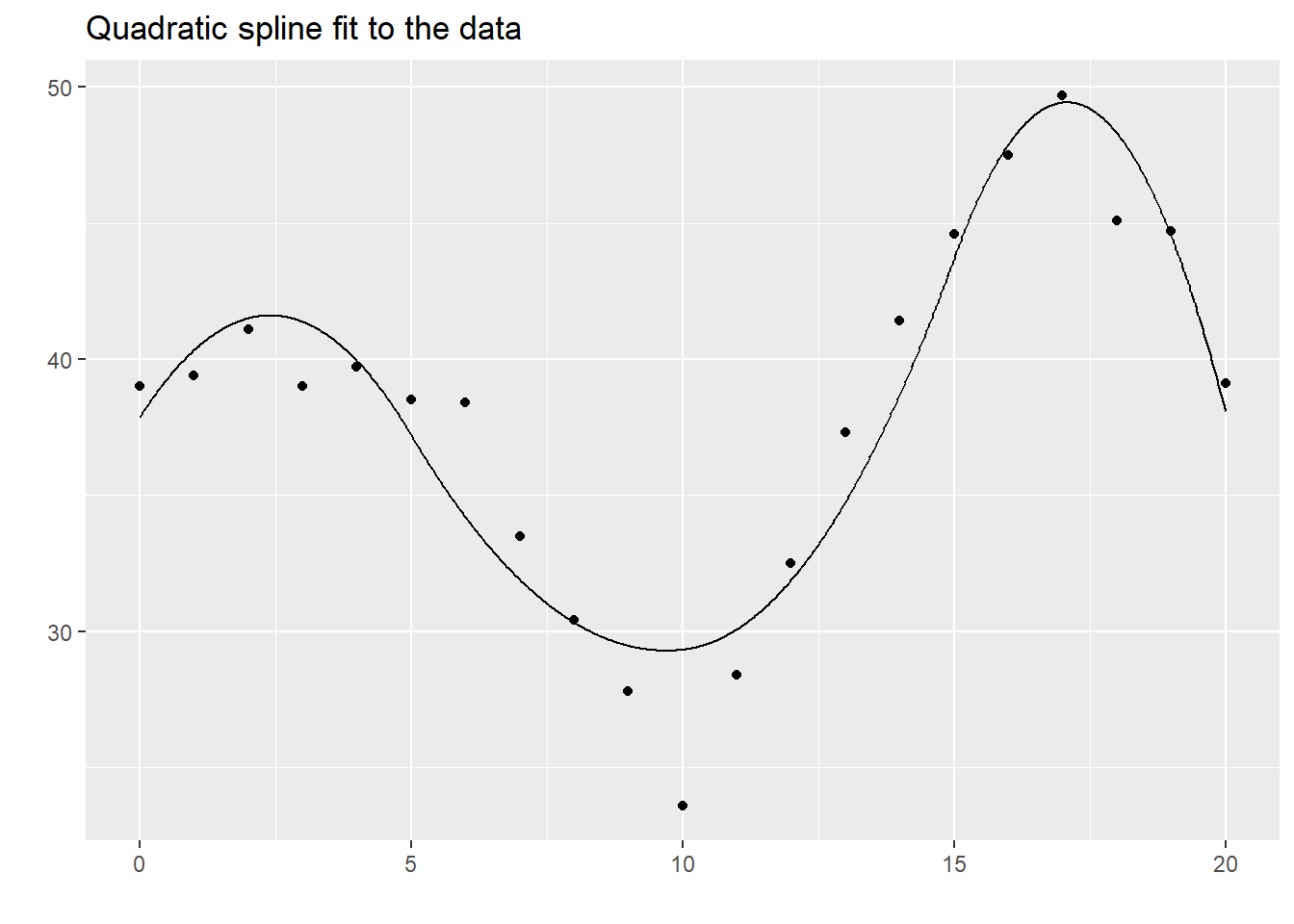The quadratic spline seems to do fairly well here and there is often little difference between it and the cubic spline. Nevertheless, cubic splines are far more common.