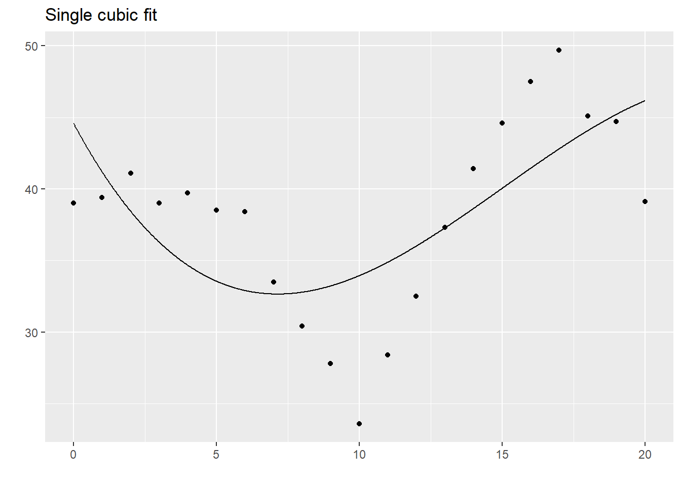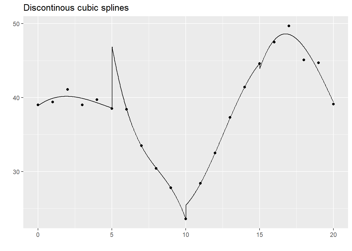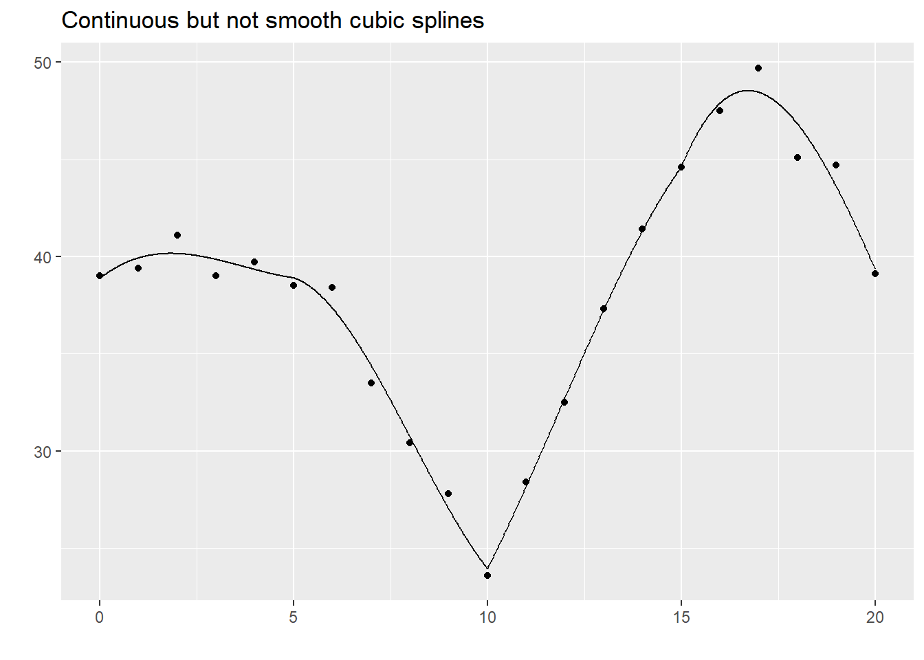 The quadratic spline seems to do fairly well here and there is often little difference between it and the cubic spline. Nevertheless, cubic splines are far more common.
