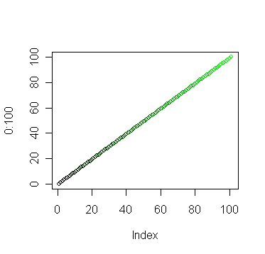 Now, what are all the possible text strings that you can specify? It turns out that there is an R function, colors() that lists all the possible colors that you can specify with a text string. In the version I am using right now (2.2.1) there are 657 choices from "aliceblue" through "yellowgreen." There are ranges of colors like azure1 through azure4. The range of grays is especially wide (gray1 through gray100) and the folks who wrote R were even nice enough to repeat that list using the British English spelling (grey1 through grey100). You can even review the same list by using the function, colours(). How thoughtful!