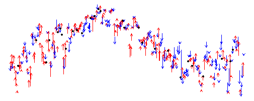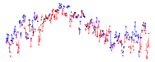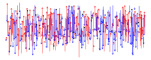 The picture above shows the better approach to randomization. It has a pattern that looks a lot like the original data, but if you look carefully, the colors (and hence the directions) of many of the arrows have switched. This is especially noticeable on the far right side of the graph, which was almost all red in the original graph, but which has a greater mix in the randomization distribution.