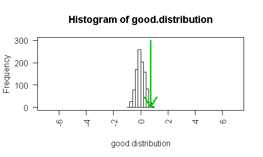 The results of this randomization appear above. Notice that the observed difference (0.7 degrees) falls well inside the randomization distribution. It turns out that 287 of the values in the bad randomization distribution are larger than 0.7, which would produce a p-value of 0.564 (you would take 287/1000, but then you have to double the p-value because it is a two sided test).