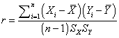 Suppose we have two variables X and Y, with means XBAR and YBAR respectively and standard deviations SX and SY respectively. The correlation is computed as
