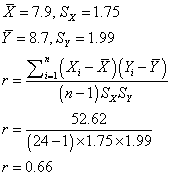 Let's compute a correlation coefficient between the 1 minute APGAR scores (X), and the 5 minute APGAR scores (Y). Here's a table showing some of the intermediate calcuations.