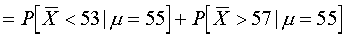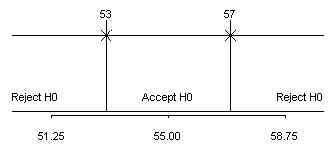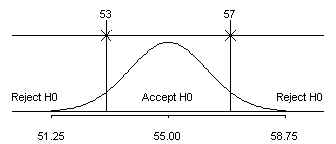 Accept H0 if XBAR is between 53 and 57, otherwise reject H0.
