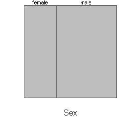 Here is an example of a simple mosaic plot. There is a publicly available data set on the mortality rates aboard the Titanic, which are influenced strongly by age, sex, and passenger class. If you wanted to compare the mortality rates between men and women using a mosaic plot, you would first divide the unit square according to the overall proportion of males and females.