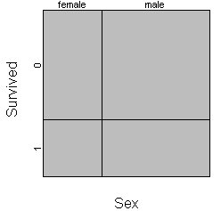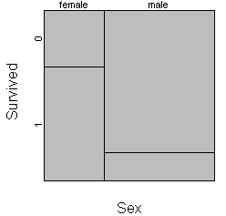 Among females, 67% survived (coded as 1 on this plot) and 33% died (coded as 0). So the female bar shows as 67/33 split. Among males, only 17% survived, so this bar shows a 17/83 split. The strong disparity in mortality between men and women is demonstrated by the lack of alignment of two vertical separating lines. If the survival rates were identical among men and women, the mosaic plot would look like this: