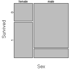 You should consider carefully the choice of which variable to split the unit square first. Here is the same mosaic plot where the unit square is split first by survival status and then by gender.