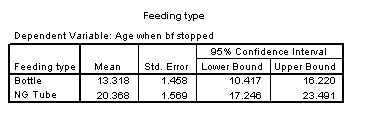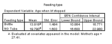 This table now adjusts for mother's age. The mean for the bottle fed group is adjusted upward to what it would be if the average age of the mothers in this group were 27 rather than 25. The mean for the NG tube group is adjusted downward to what it would be if the average age were 27 instead of 29. Note that the adjusted mean duration is half a week higher than the crude mean duration in the bottle group and that the adjusted mean duration is half a week lower than the crude mean duration for the NG tube group. This confirms that the difference between the two feeding groups is roughly 6 weeks, after adjusting for mother's age. This is one week less than the crude model.