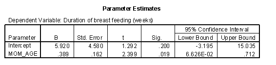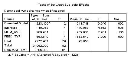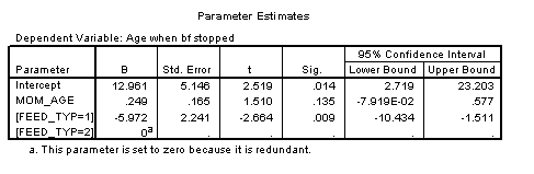 This table shows that the effect of bottle feeding is to decrease duration of breast feeding by about six weeks, after adjusting for mother's age. Each year that a mother is older increase the duration of breast feeding by a quarter of a week.