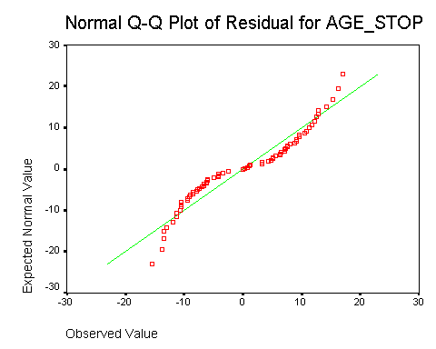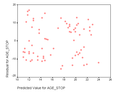 predicted age_stop = 13 + 0.25 * 30 - 6 * 0 = 20.5 weeks.