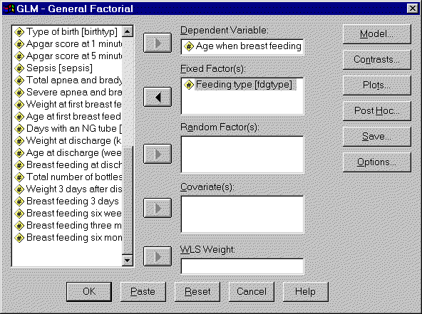 A crude model for comparing duration of breast feeding to feeding group would be a t-test. I prefer, however, to present a general linear model because it provides a unifying framework for diverse statistical methods like analysis of variance, analysis of covariance, multiple linear regression, repeated measures designs, and t-tests.