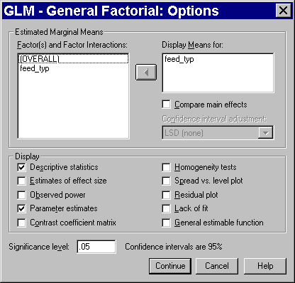 The general linear model uses an F test instead of the t test, but in this context, these two tests are mathematically equivalent. The p-value for comparing feeding groups is .001, which indicates a significant difference between the two groups.
