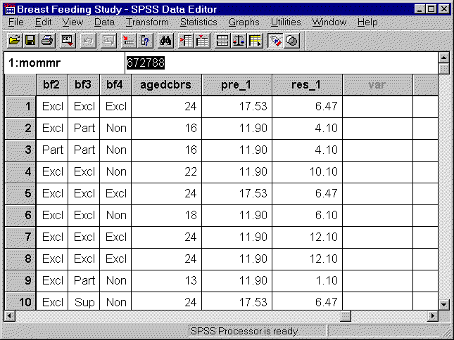The file bf.sav contains data from a research study done at Children's Mercy Hospital and St. Luke's Medical Center. The data comes from a study of breast feeding in pre-term infants. Infants were randomized into either a treatment group (NG tube) or a control group (Bottle). Infants in the NG tube group were fed in the hospital via their nasogastral tube when the mother was not available for breast feeding. Infants in the bottle group received bottles when the mothers were not available. Both groups were monitored for six months after discharge from the hospital.