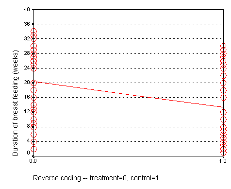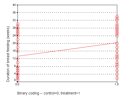 So, for example, if you recruited a mother into the treatment group and she was 30 years old, you would predict the duration of breast feeding to be
